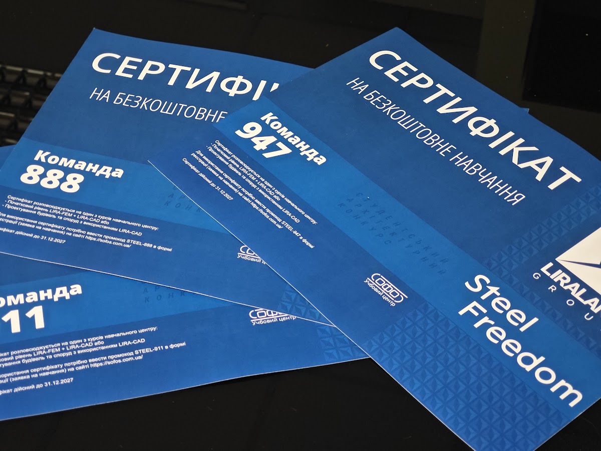 Три студентські команди отримали сертифікати на проходження навчання з розрахунку будівельних конструкцій у навчальному центрі розробника LIRALAND Group. Сертифікати були надані за наполегливість, технічну грамотність та прагнення професійного розвитку.
